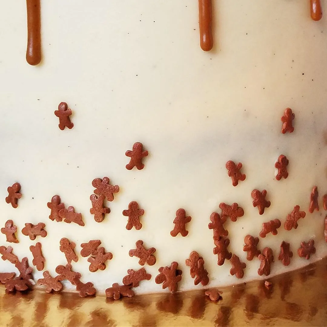 This cake is a gingerbread celebration! It’s classically decorated with some modern flair to have you pining for a slice. It’s iced with silky smooth buttercream frosting and covered in mini gingerbread man sprinkles. To top it off, gingerbread drips and handmade mini gingerbread man cookies.