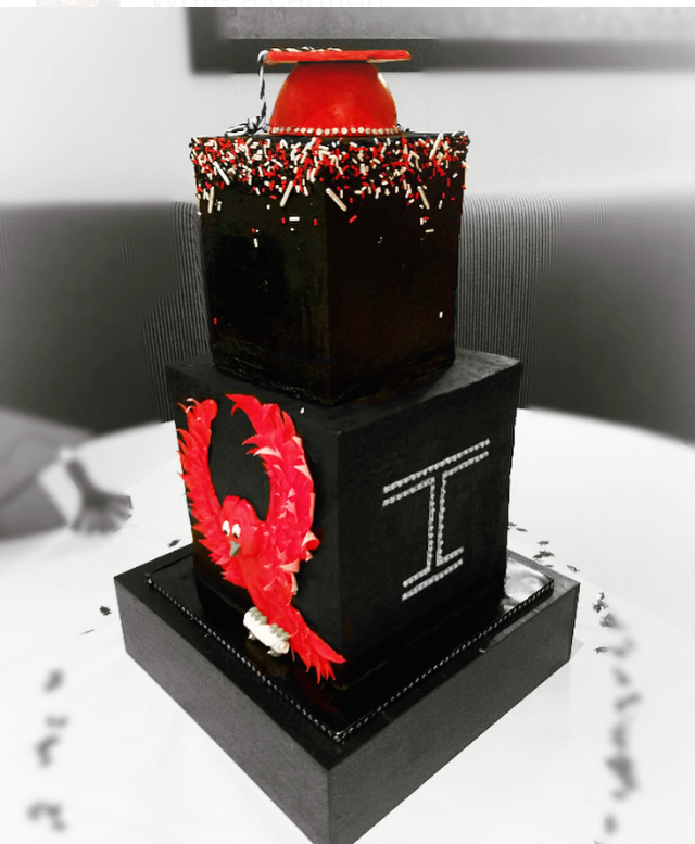This cake was made for a graduation celebration! It’s a double-tall ganache cake with fondant accents. The custom colored sprinkles, studded school logo, 2D mascot, mini diploma, and rice crispy treat graduation cap top this cake off. As always, everything is completely edible, even the Temple Owl and his wings!